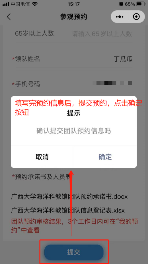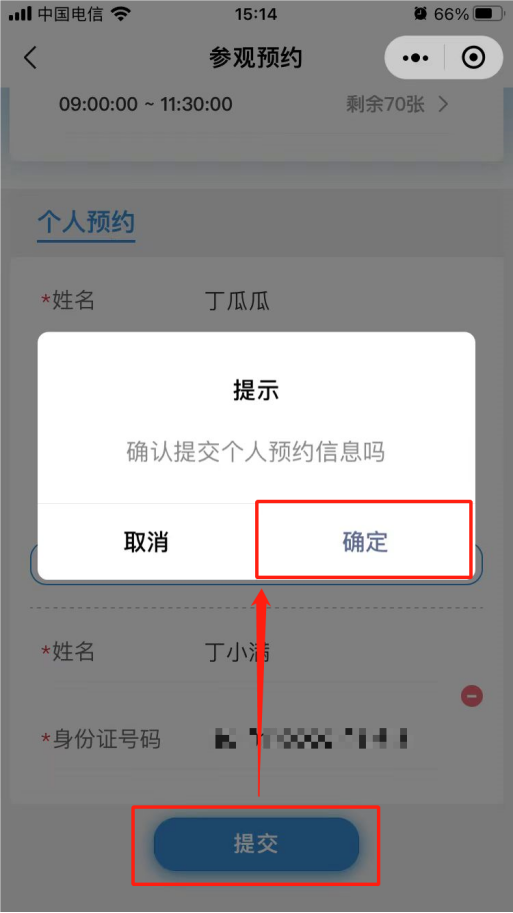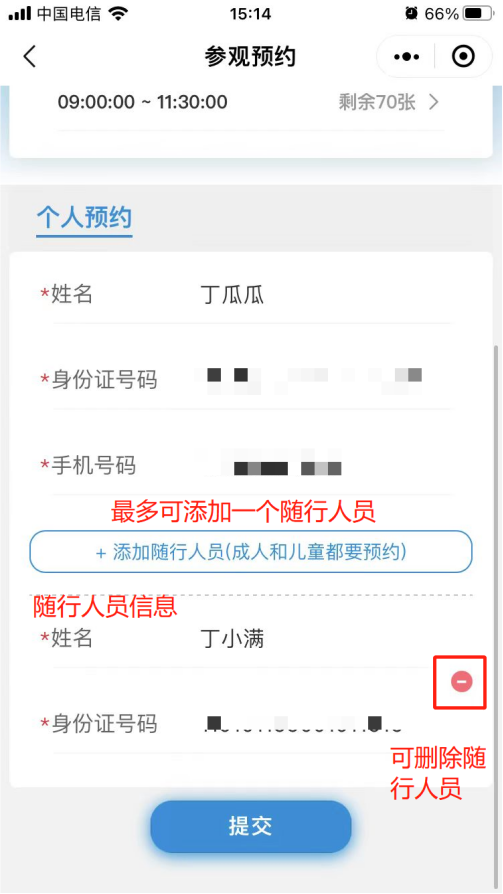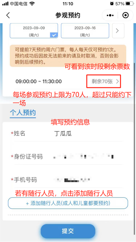 6. 填写预约人和随行人员信息,每场参观预约上限位70人,超过人数无法预约,只能约下一场次。