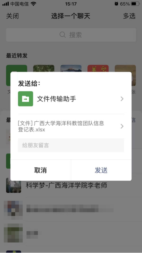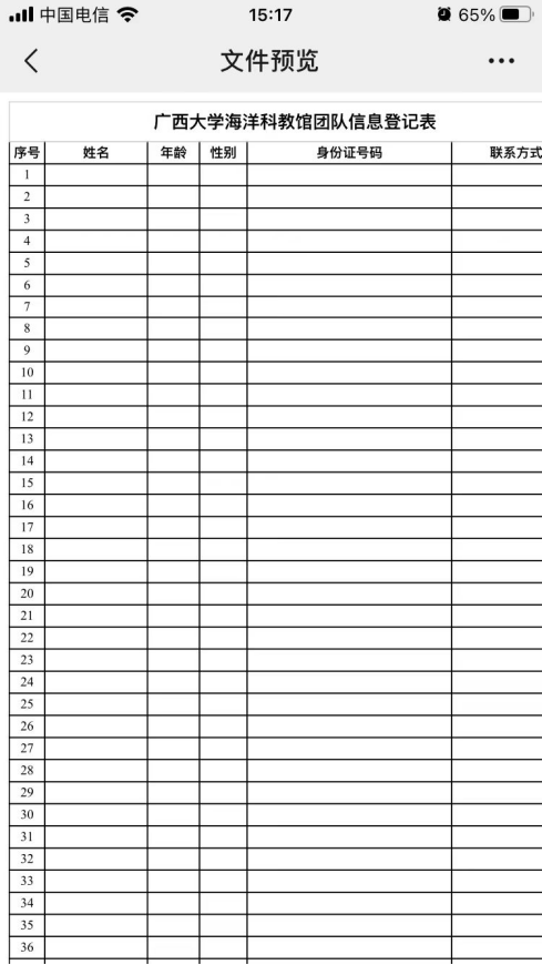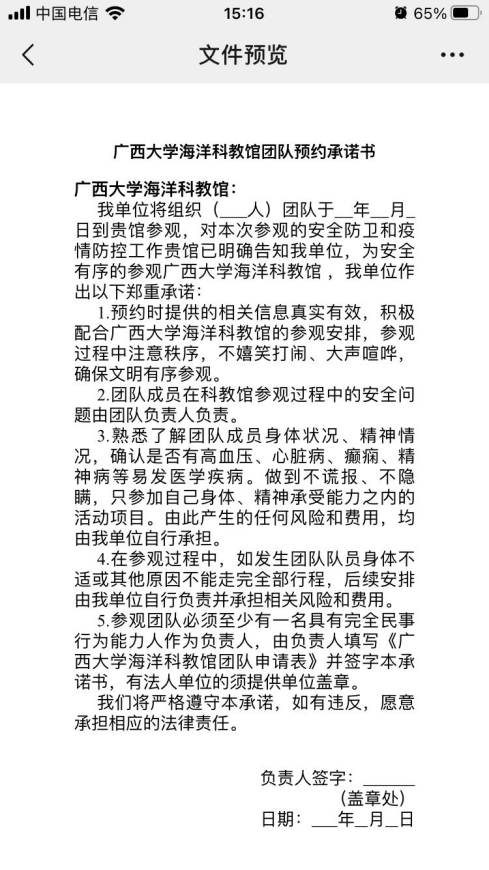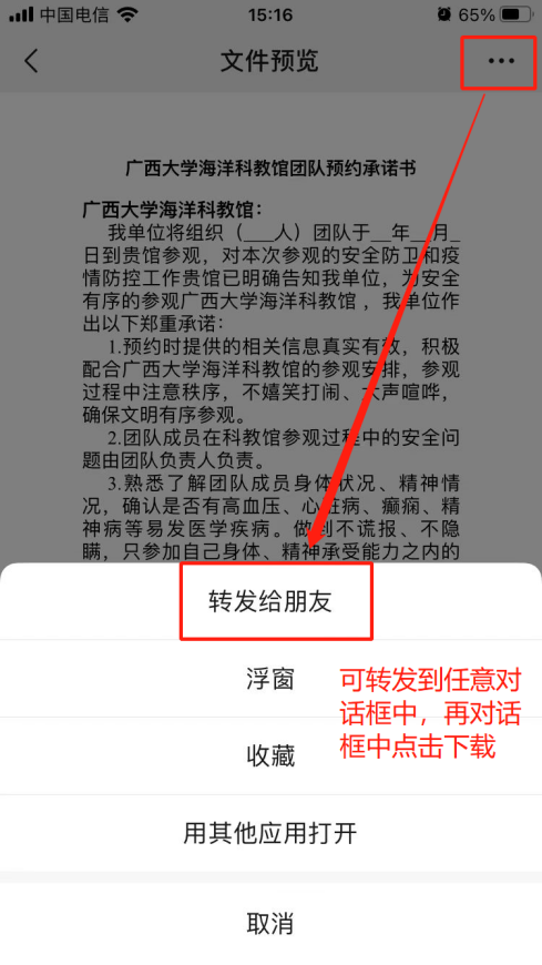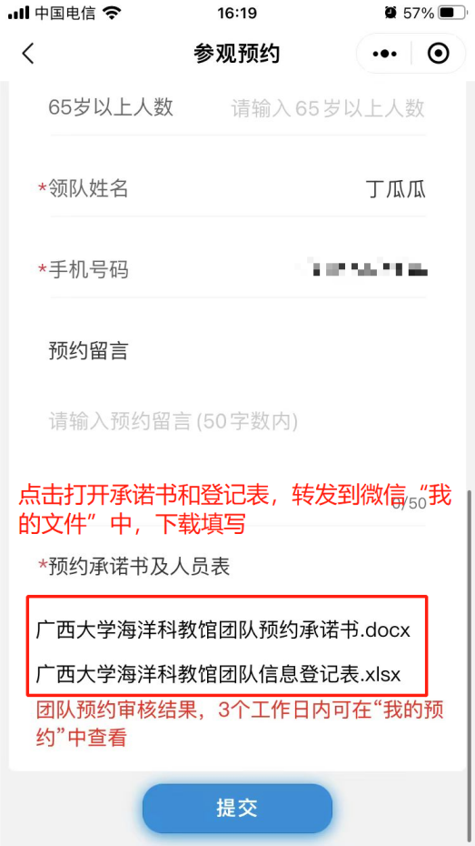 5. 预约申请提交后,可先准备团队预约承诺书和人员登记表,点击“Ky开元集团海洋科教馆团队预约承诺书”或“Ky开元集团海洋科教馆团队信息登记表”,转发至微信对话框中(推荐“文件传输助手”),下载后按要求填写预约承诺书和人员登记表内容,填写完成后发送给馆内工作人员,由工作人员审核。