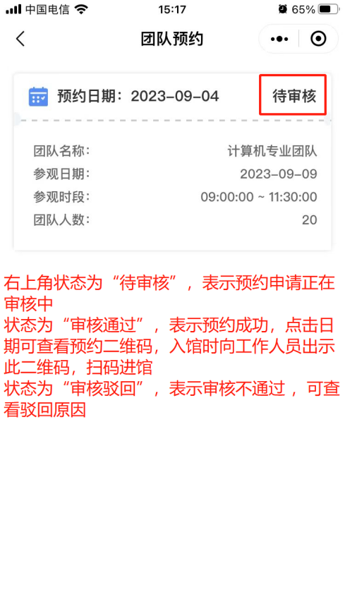 6. 团队预约记录/预约审核结果可在个人中心-团队预约门票中查看。