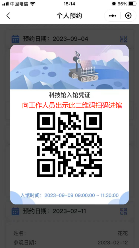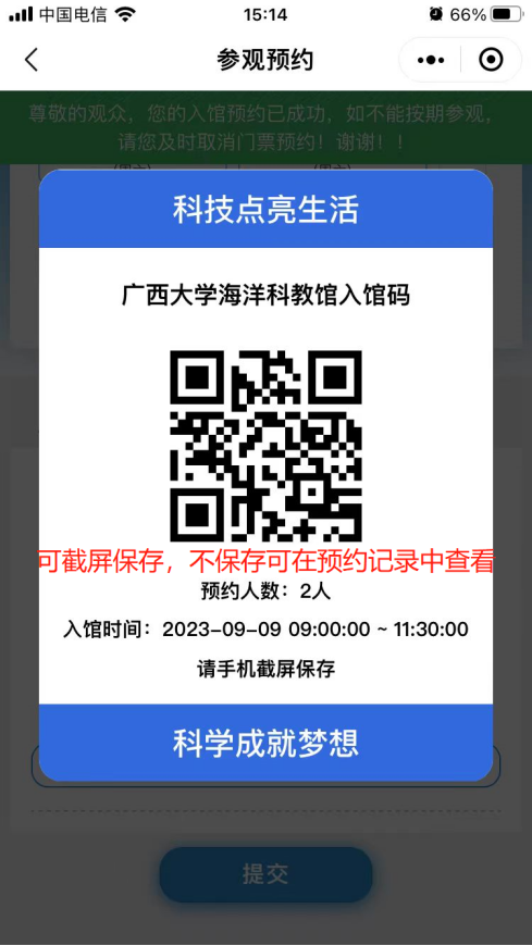 7. 提交预约信息,点击确定按钮,预约成功,生成预约二维码,入馆时需向馆内工作人员出示预约二维码,扫码进馆。