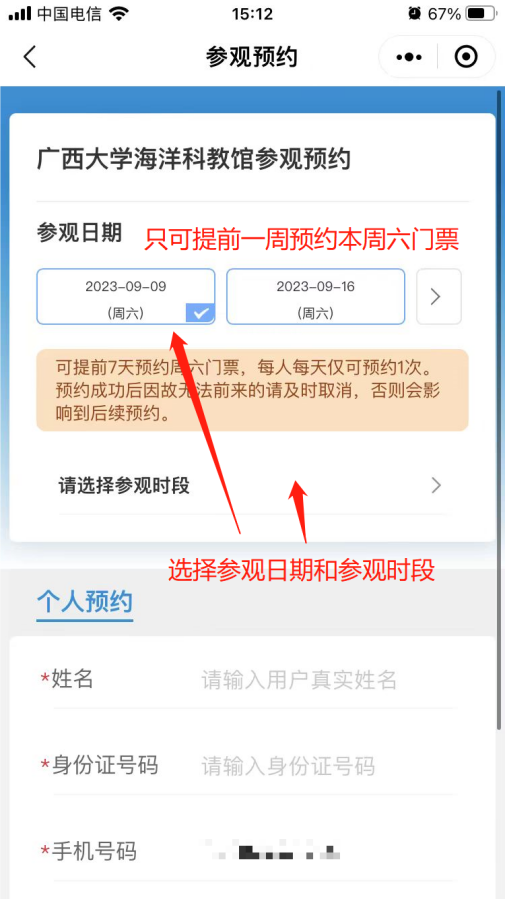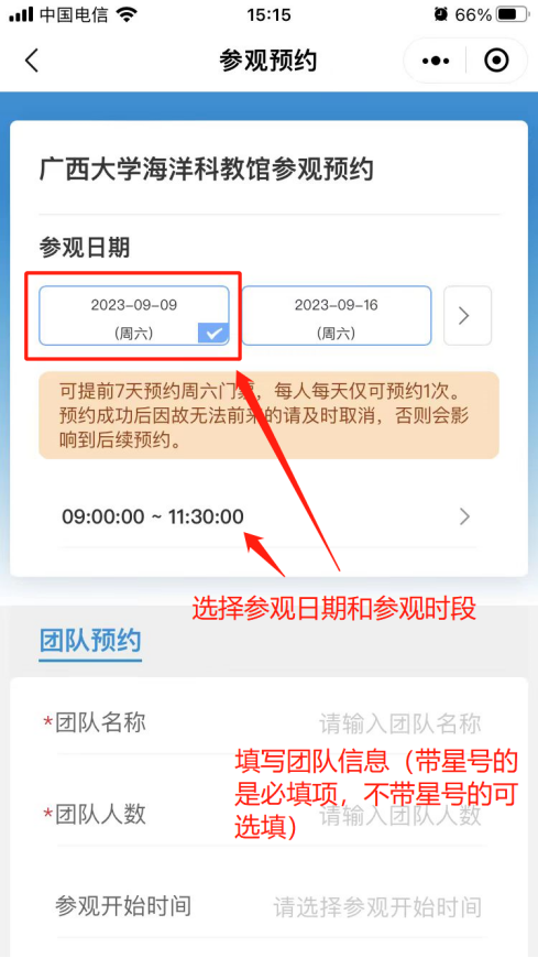 3. 预约界面选择参观日期,参观时段,填写预约信息(带星号的是必填项,不带星号的可选填)。