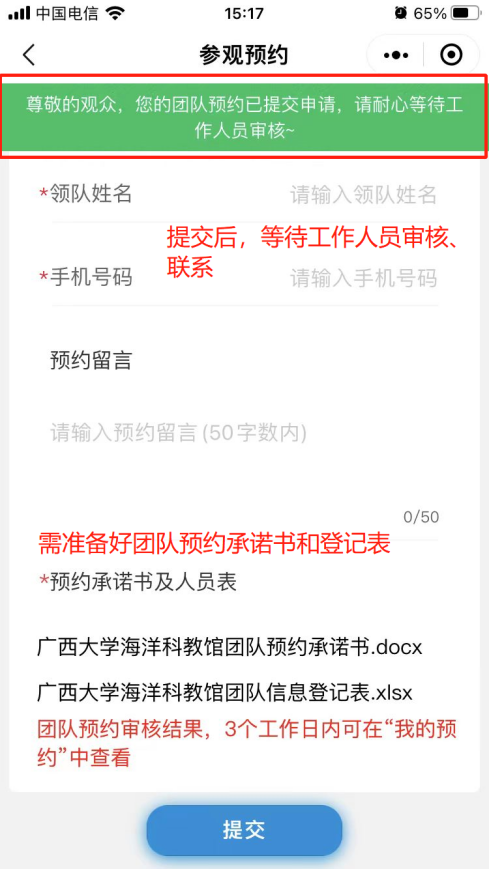 4. 预约信息填写完成后可提交,提交成功后,等待馆内工作人员联系审核。