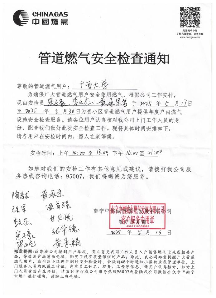 为保障校内燃气用户的用气安全,后勤基建处联系南宁中燃城市燃气发展有限公司开展本年度第二次管道燃气入户安全检查,请各住户于2025年5月17日至30日期间做好相关配合工作,现将具体通知如下:
