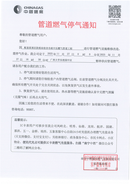 接到南宁中燃城市燃气发展有限公司通知,因配套原郊区防疫站宿舍市政中压燃气管道工程进行管道燃气设施维修改造,需停气作业。